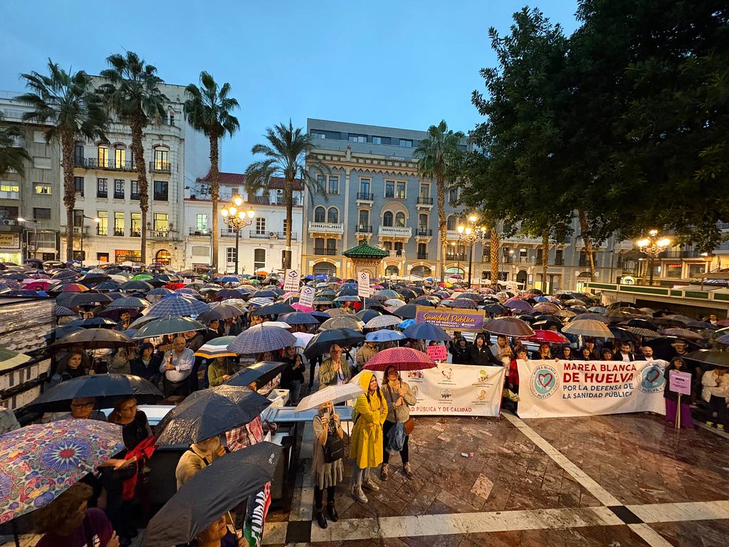 Miles de ciudadanos recorrieron este martes las calles del centro de Huelva en una manifestación convocada por la plataforma Onubenses Unidos por una Sanidad Pública de Calidad (Onusap). Bajo el lema “Nos mojamos por nuestra sanidad”, los onubenses se movilizaron para reclamar una atención médica digna, universal y de calidad.